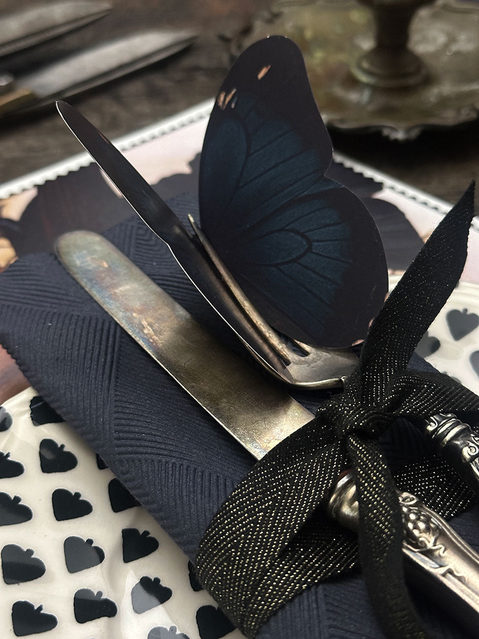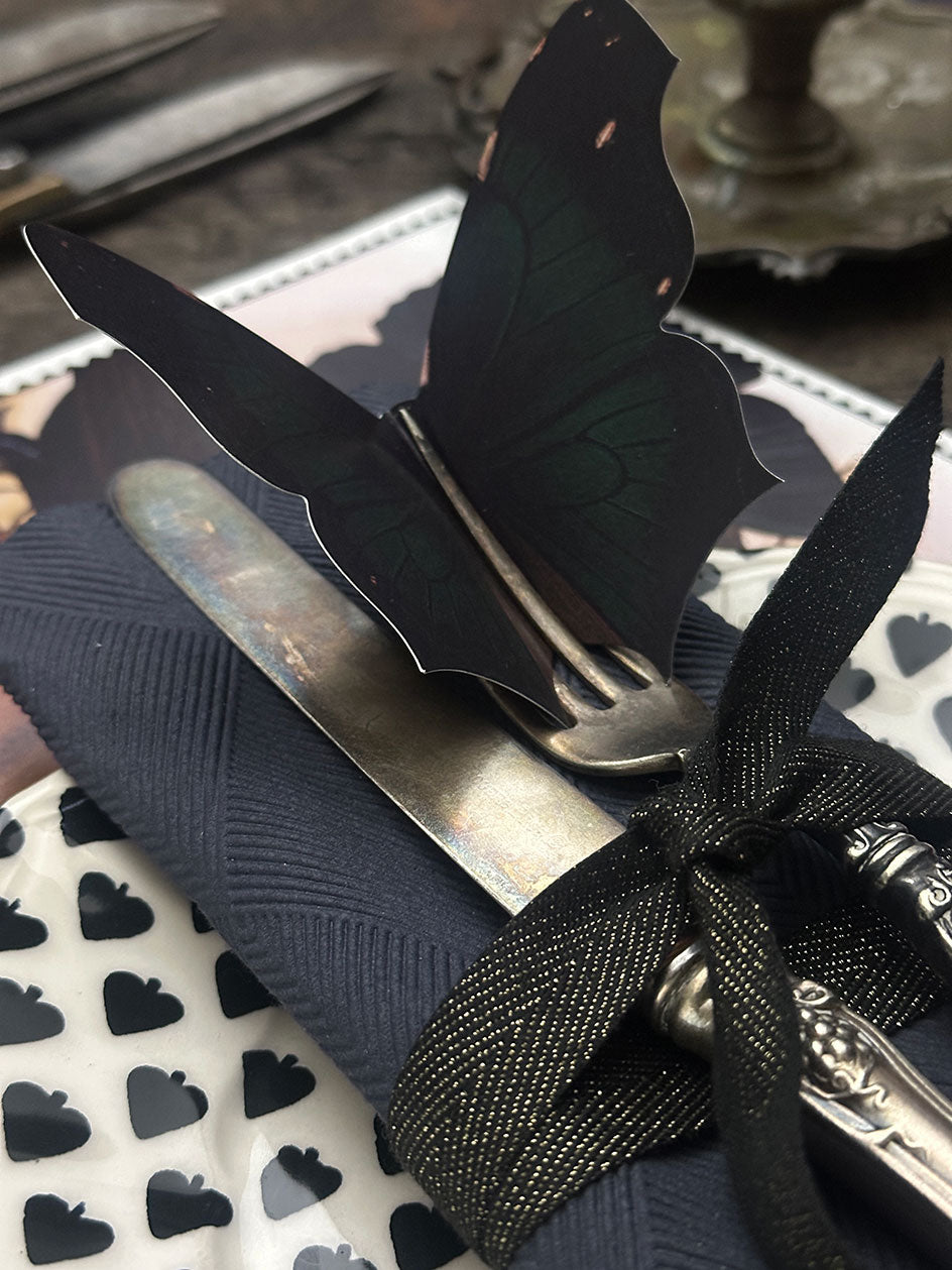 Es hora de hacer que la mesa vuele a un lugar oscuro.... este grupo de mariposas son un delicado pero tétrico accesorio de mesa...