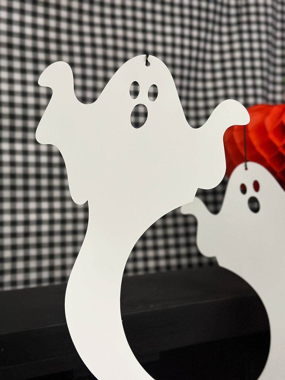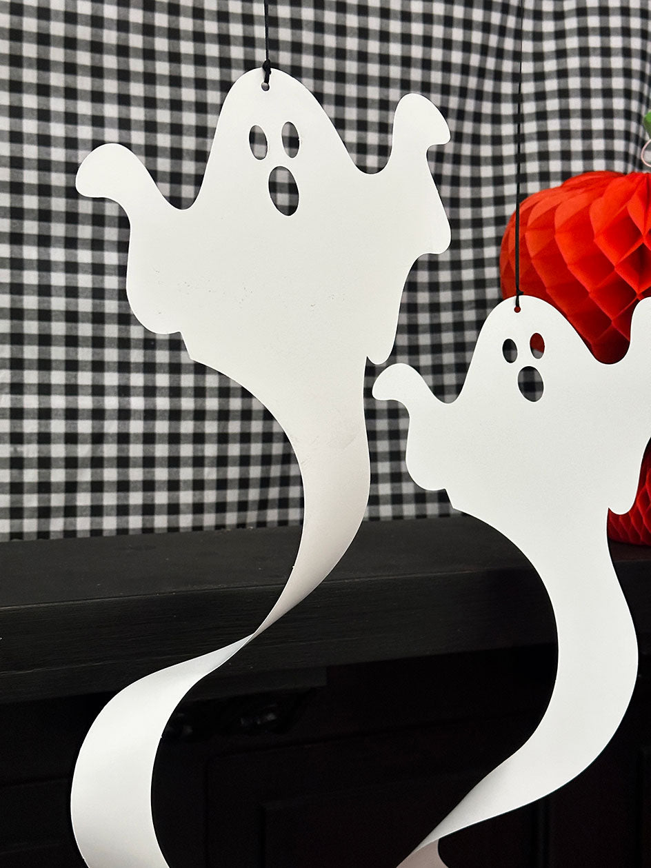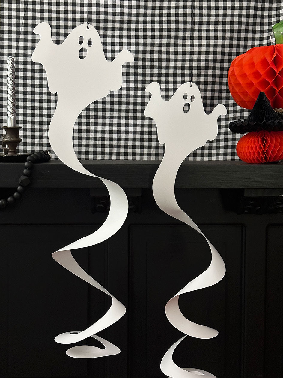 Agrega un toque mágico y espeluznante a tu Halloween con estos adorables fantasmas colgantes de papel. Su diseño en espiral da la ilusión de que flotan en el aire, creando una atmósfera encantadora y misteriosa.