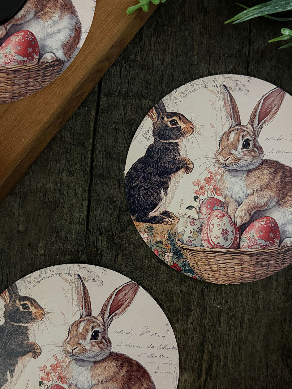 Nuestros posavasos de Pascua están impresos en papel blanco de 280 gramos, con ilustraciones cuidadosamente seleccionadas que dialogan con el resto de la colección de pascua. Cada diseño aporta textura visual, color y un guiño narrativo que enriquece la mesa sin sobrecargarla.