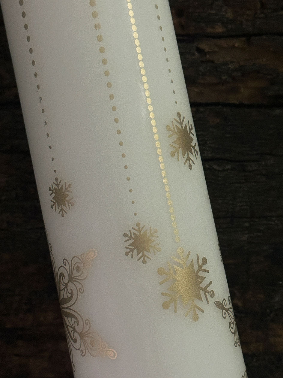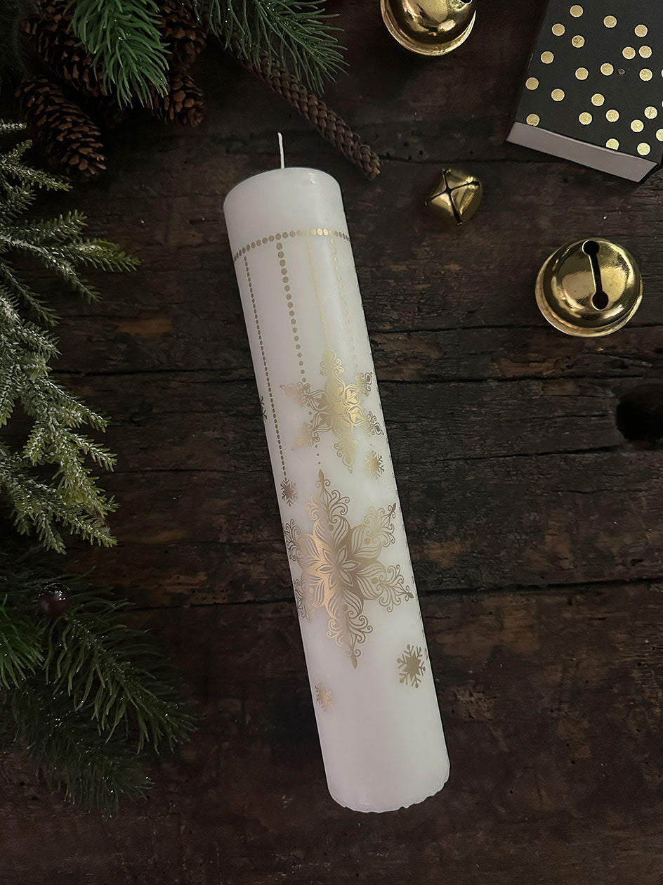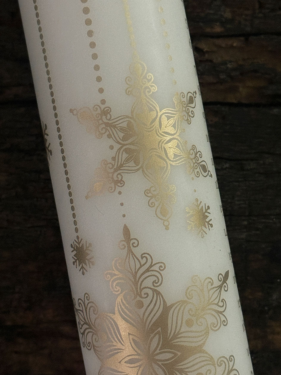 Esta perfecto cirio impreso en color dorado se puede complementar con unas ramitas de pino y adornos de Navidad para armar un lindo centro de mesa .