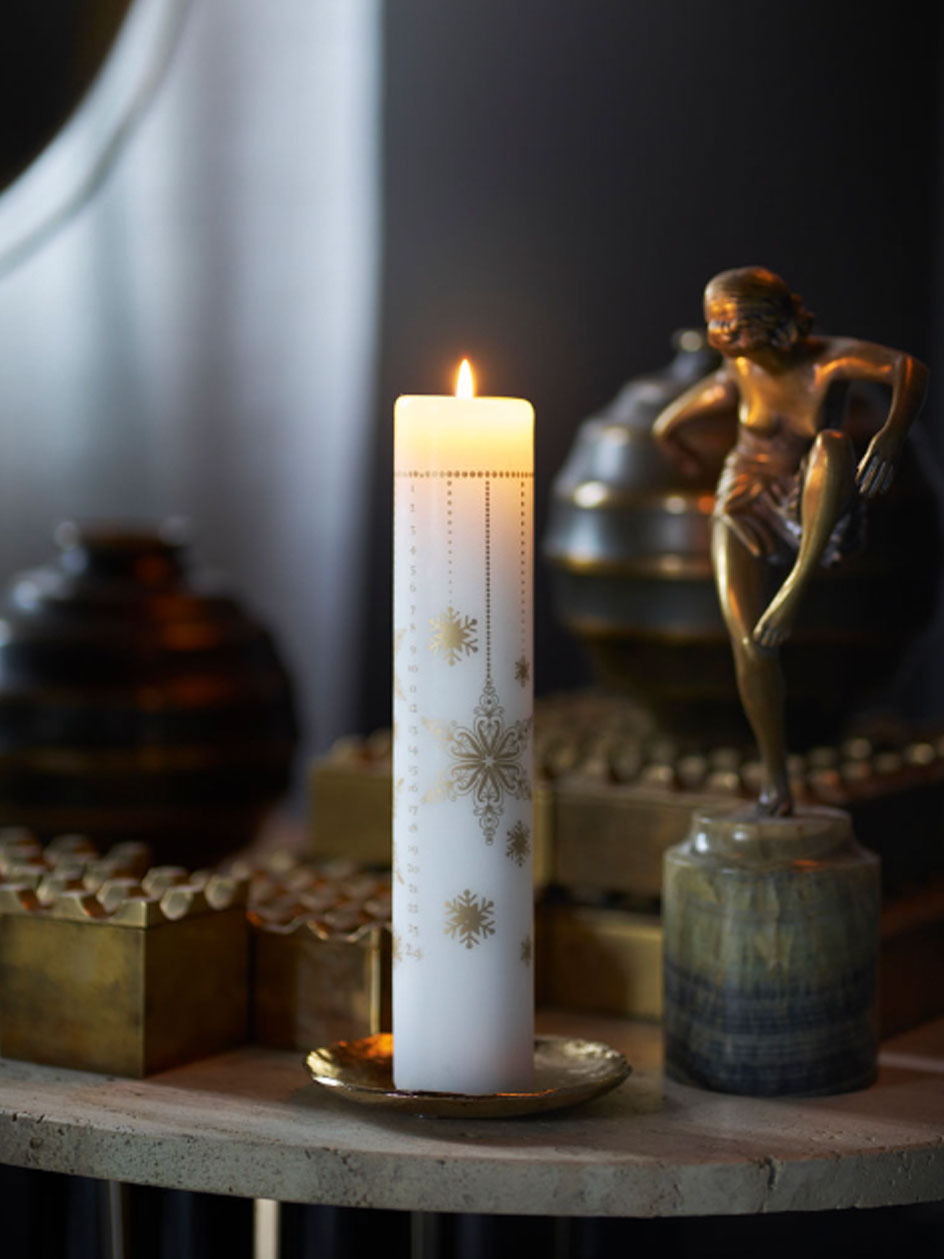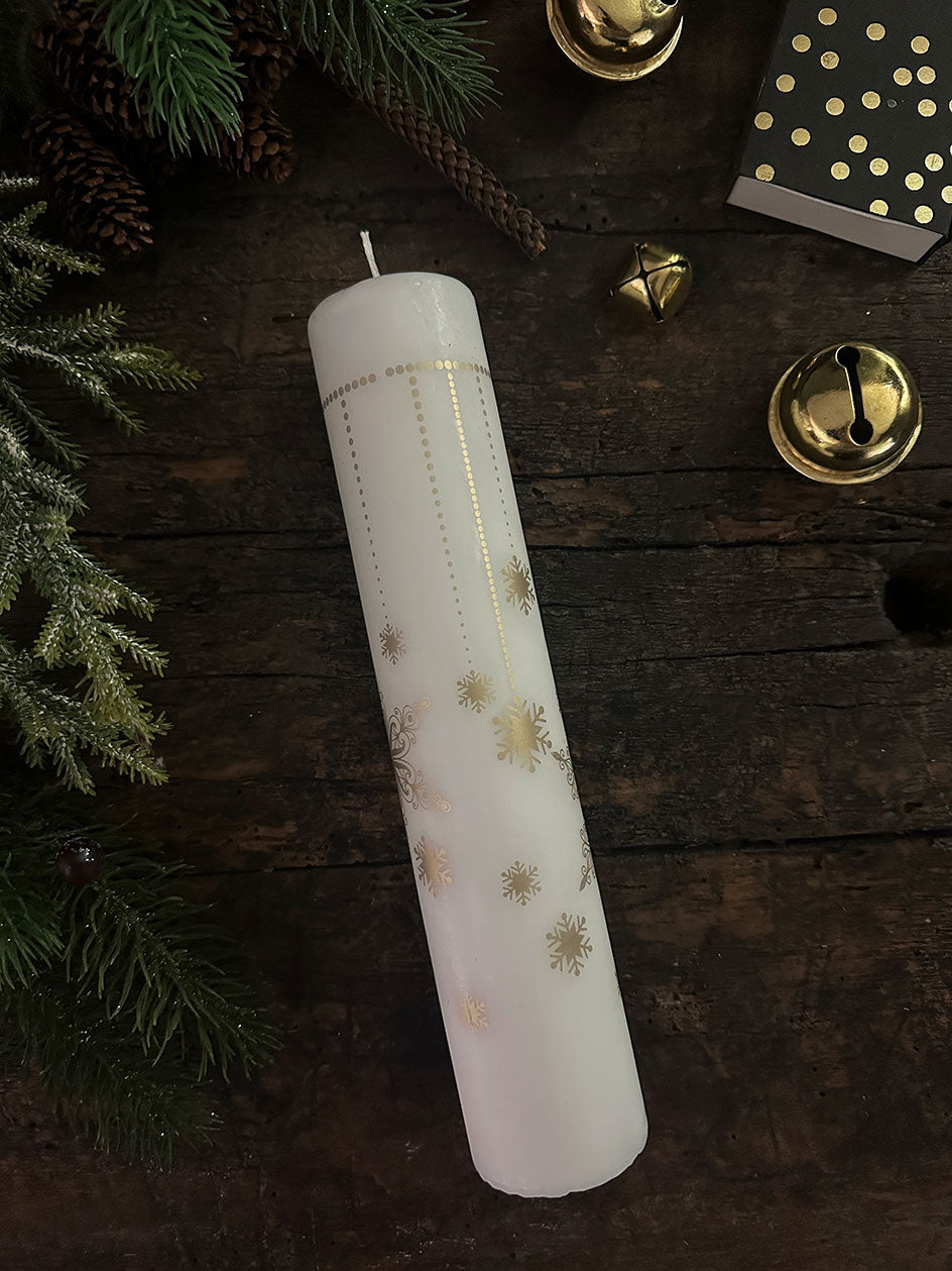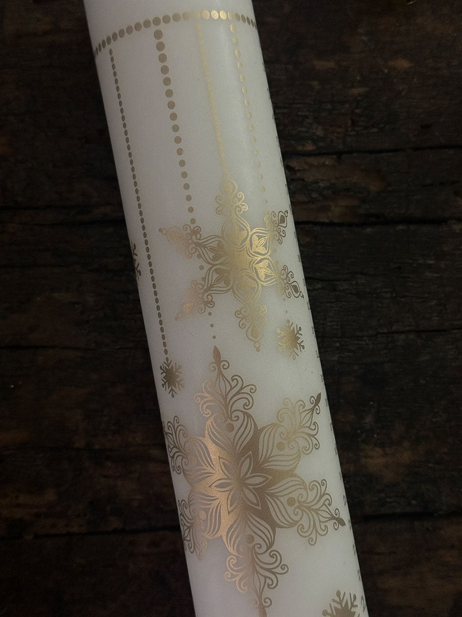 Esta perfecto cirio impreso en color dorado se puede complementar con unas ramitas de pino y adornos de Navidad para armar un lindo centro de mesa .