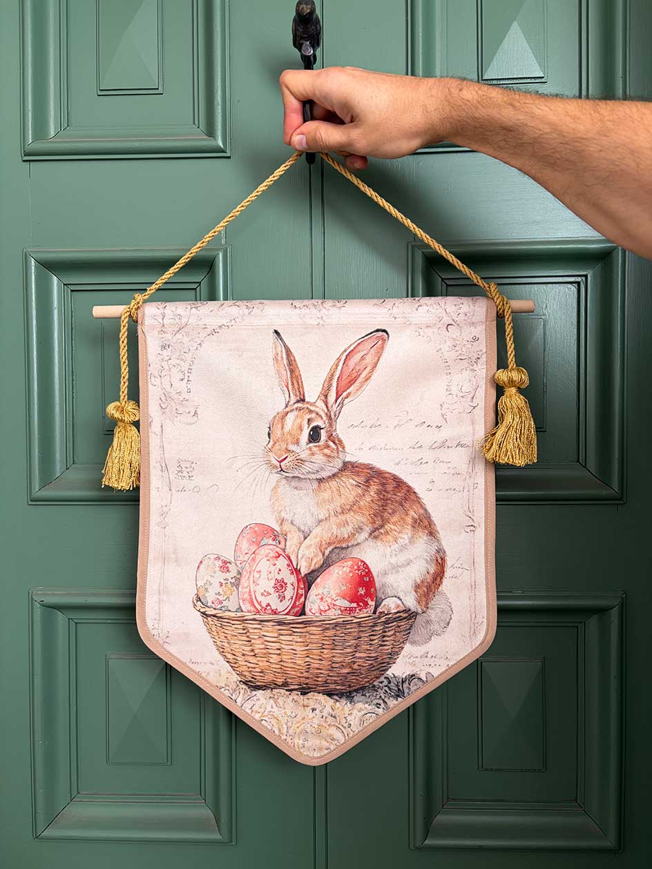 Este banderín decorativo de tela impresa está pensado para vestir puertas, muros o rincones especiales durante la temporada de Pascua. Su ilustración de conejo con canasto aporta un guiño encantador y festivo desde el primer momento.