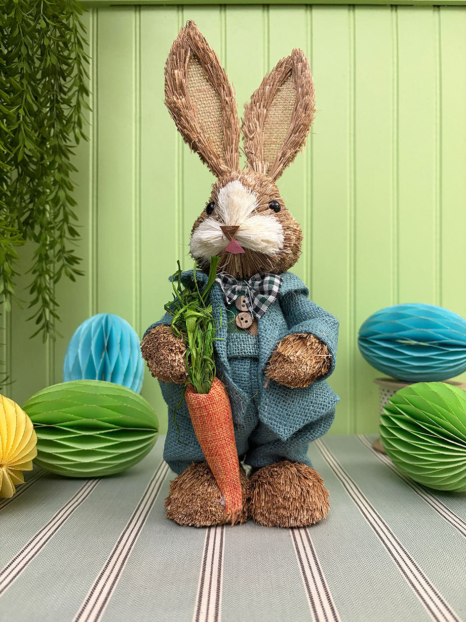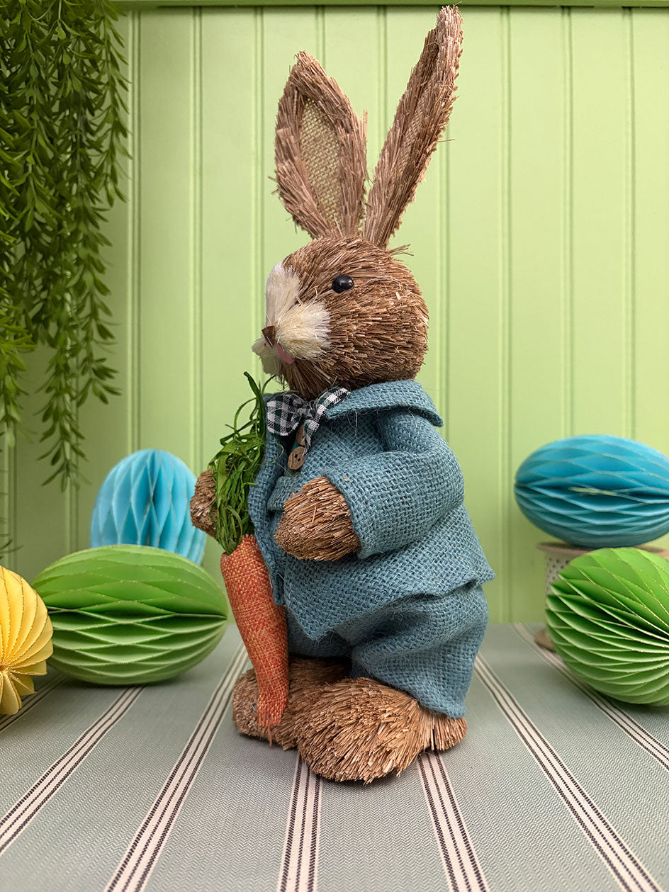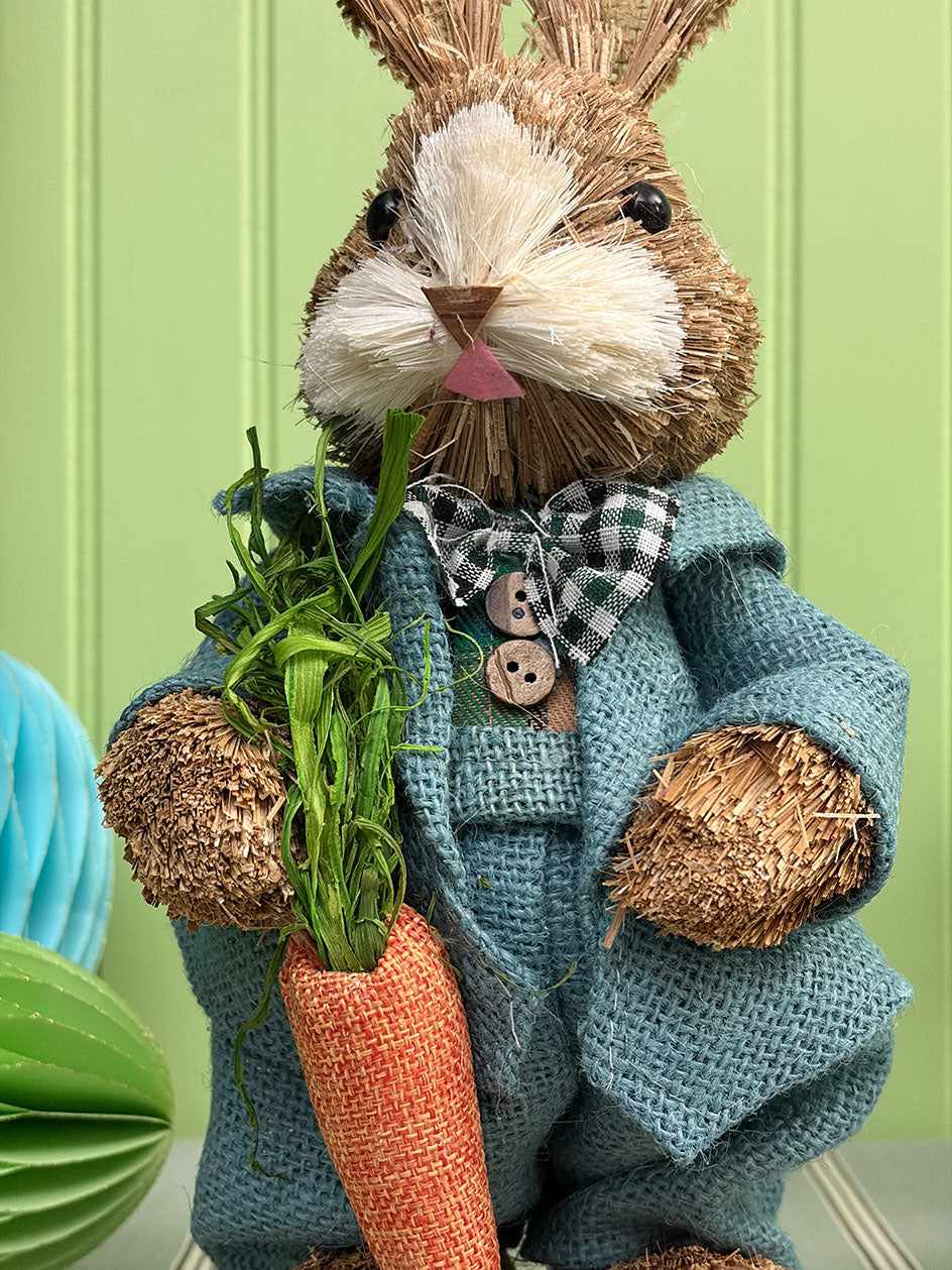 Nuestros conejos de arpillera están confeccionados en fibras naturales, con detalles cuidadosamente trabajados en el vestuario y los accesorios. Cada uno sostiene una zanahoria o canastita, aportando carácter y narrativa a la escena.