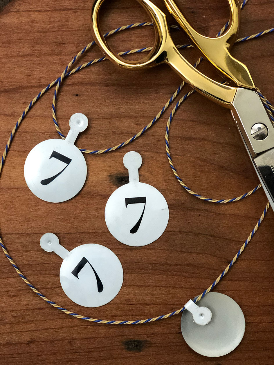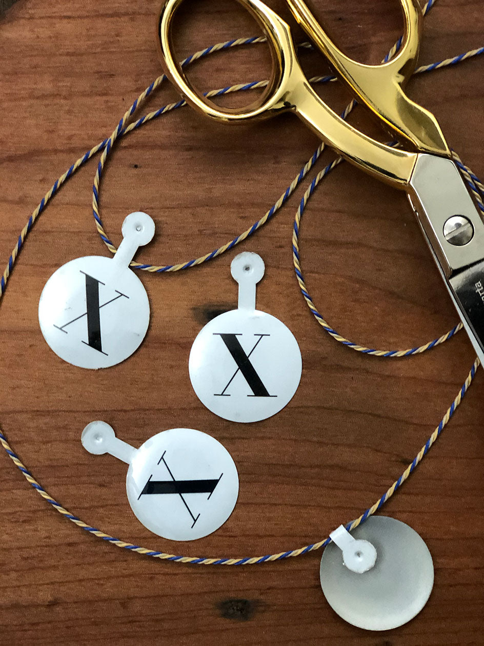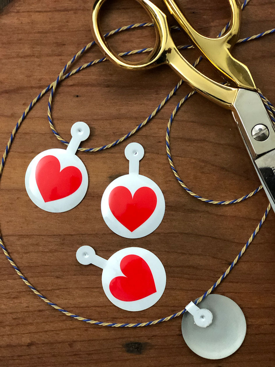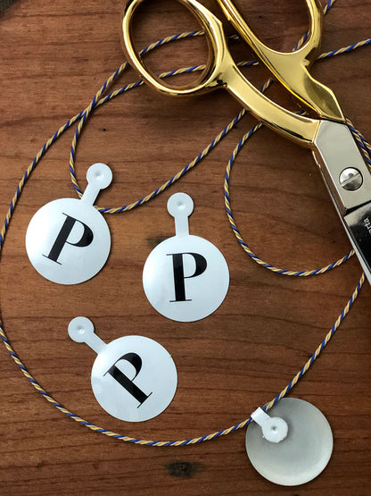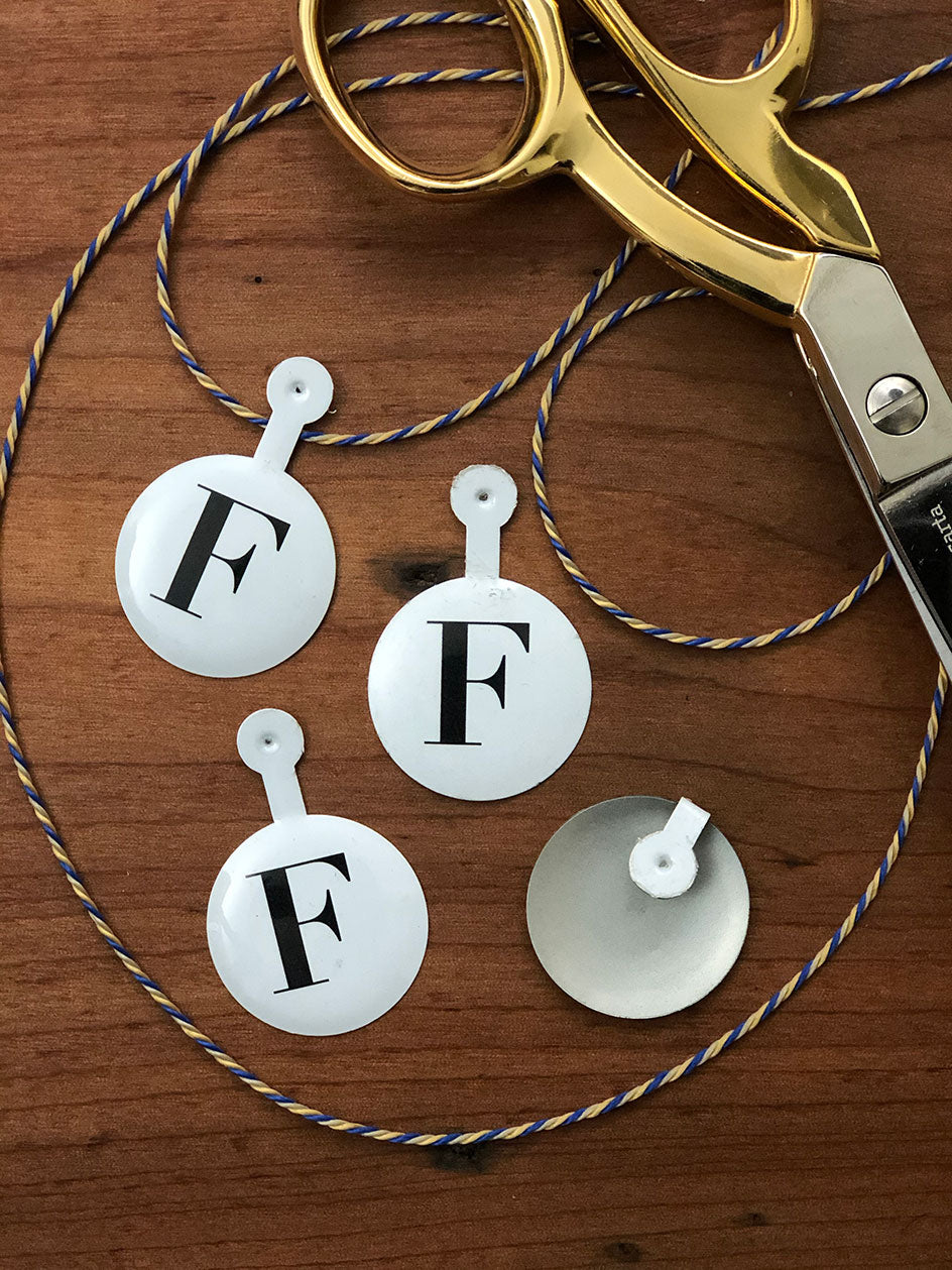 Tab metálico esmaltado de 30 mm de diámetro Incluye aleta metálica para poder fijar en cintas y cordonesIdeal para armar guirnaldas, colocar en regalos, etc